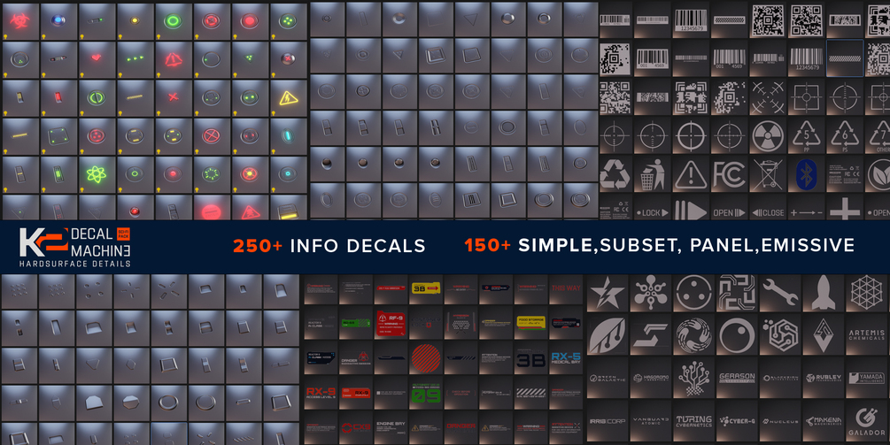 K2 Decal Machine Pack is an asset pack of decals (decal machine ready) for adding details to your hard surface scenes or objects. It is a mountain of decals for scifi hardsurface tech projects.